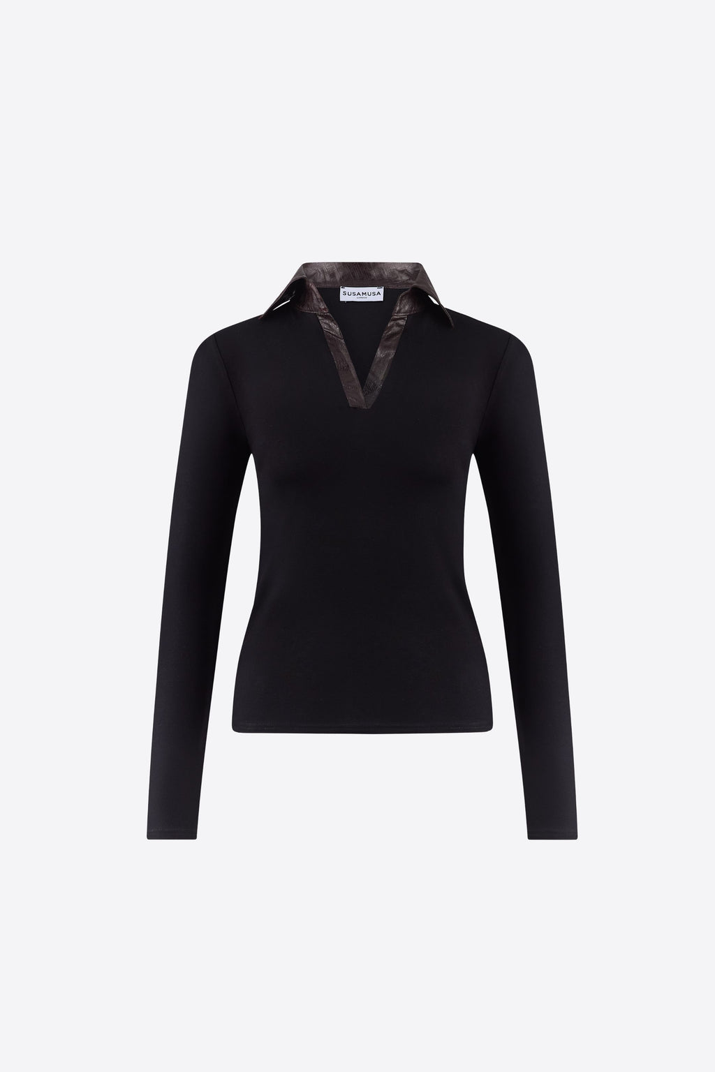 The Nyx Top, made from a soft jersey finished with a leather collar trim. Effortless and understated, the Nyx top is designed to be lived in.