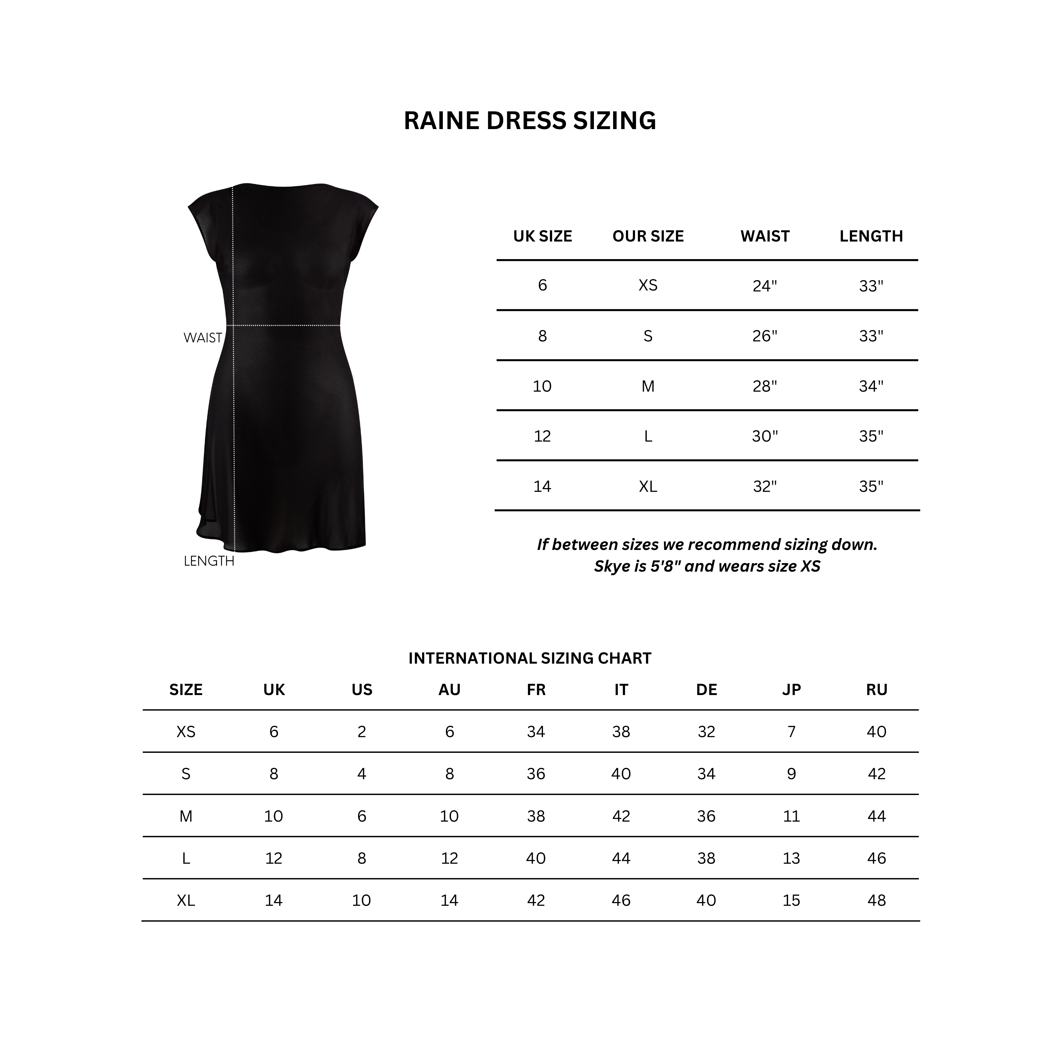Runs slightly big, if between sizes we recommend sizing down. Skye is 5'8" and wears size XS.