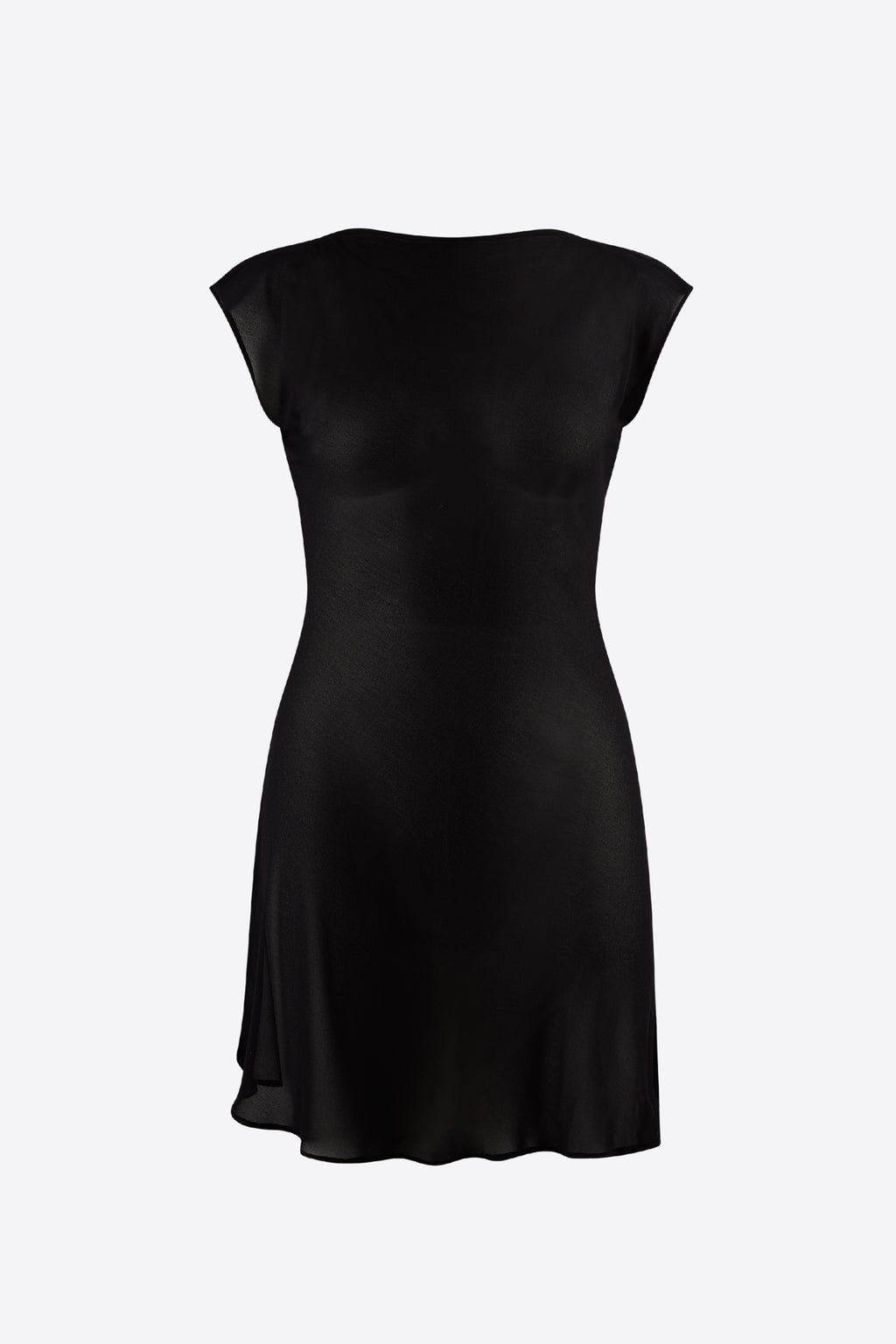 The Raine Dress, a sheer mini dress cut on the bias, featuring a straight neckline and cap sleeves. The Raine Dress is the Little Black Dress reimagined in sheer.