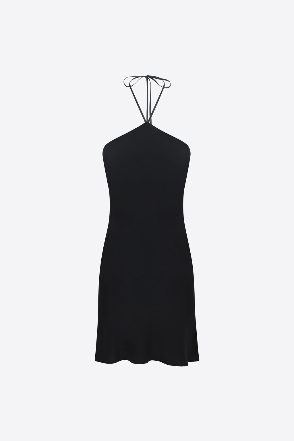 The Lynx Mini Dress, made from fine crepe and finished with a Nappa leather halter-neck tie. The Lynx Dress is our fierce take on the little black dress.