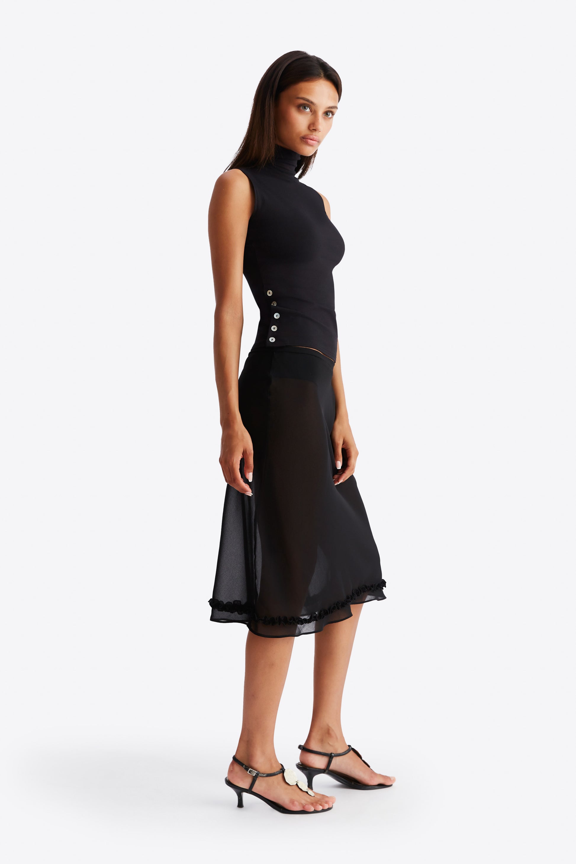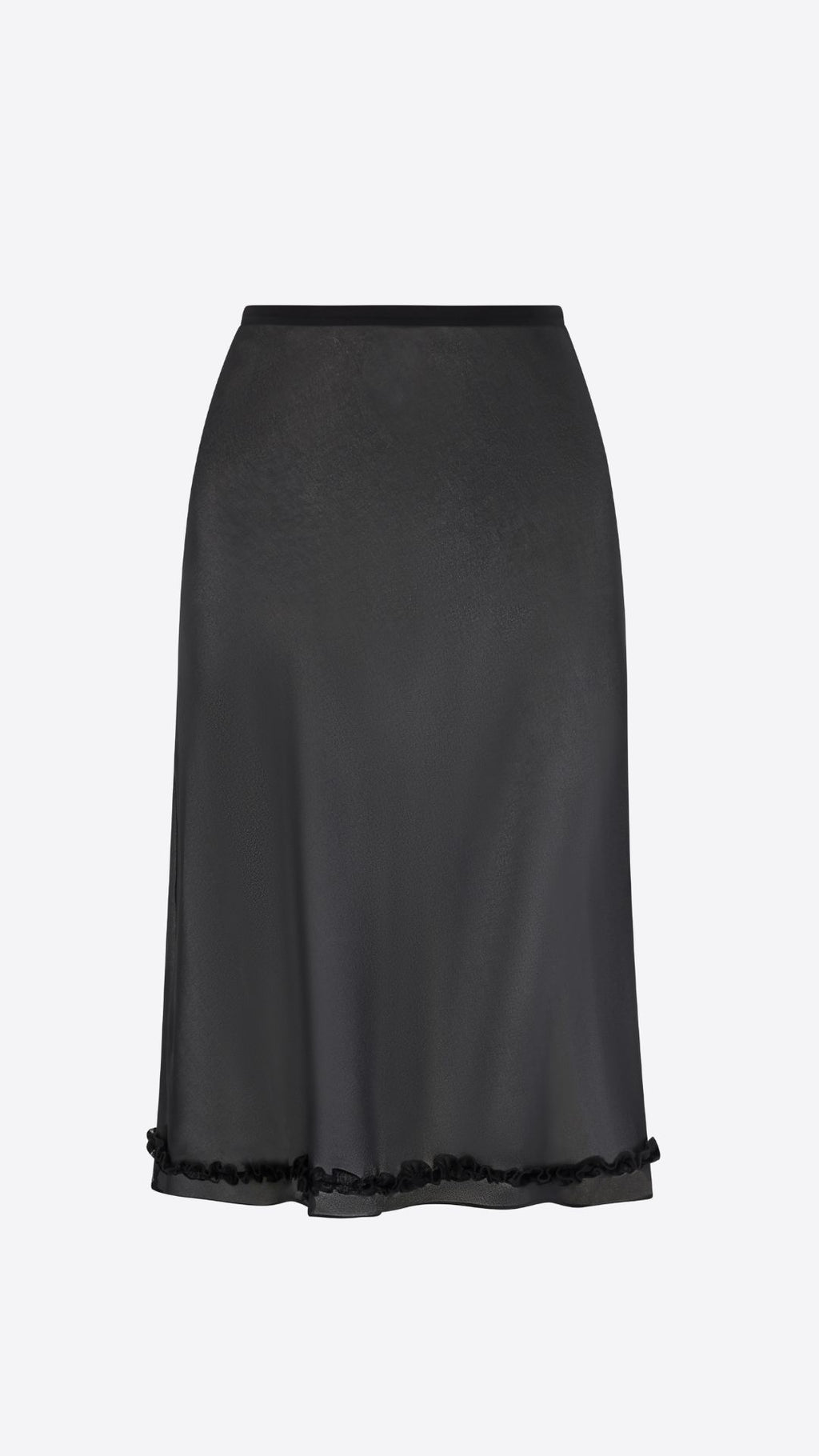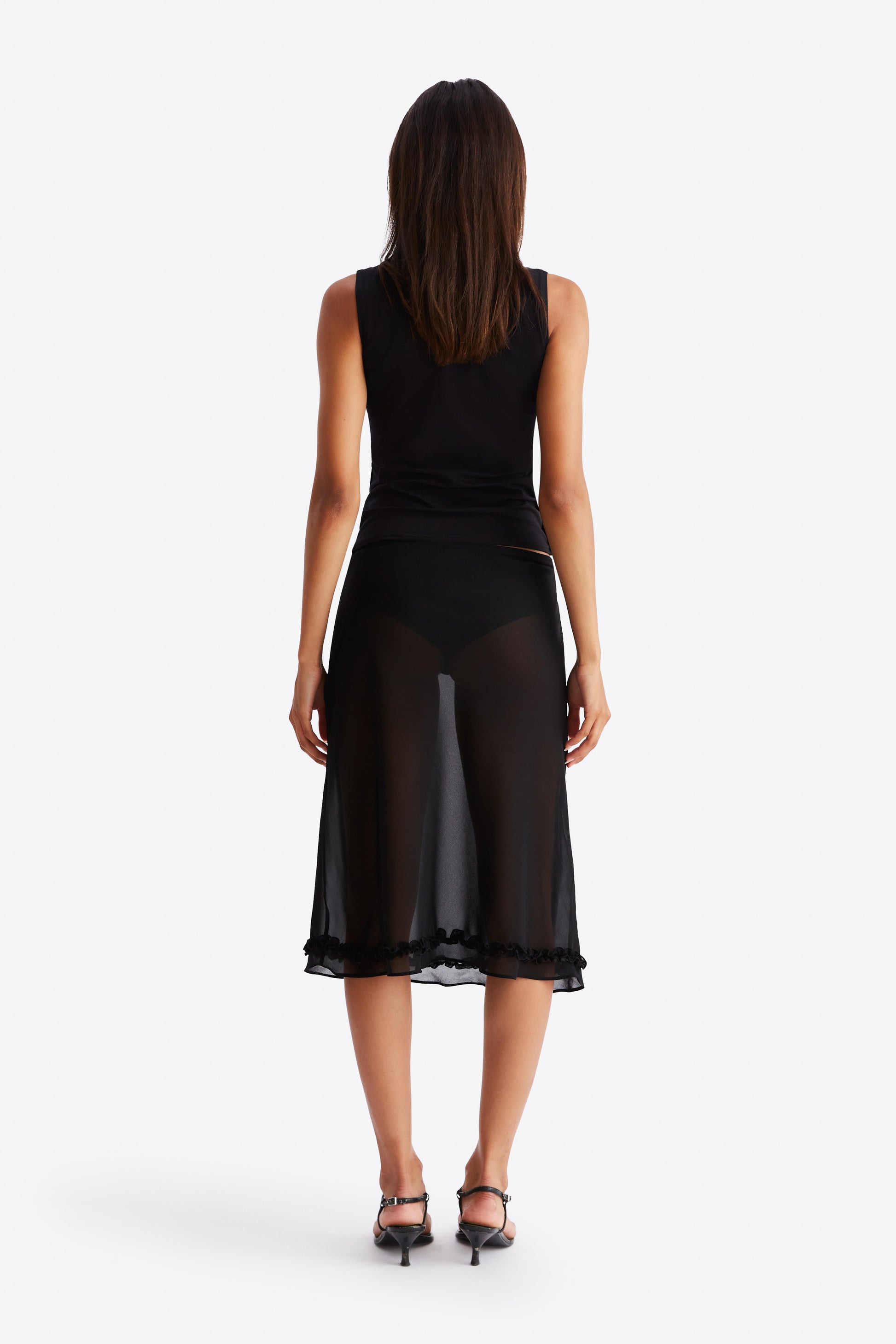 The Meadow Skirt, a sheer midi skirt that is cut on the bias and features ruffle detailing. The Meadow is designed to move in.