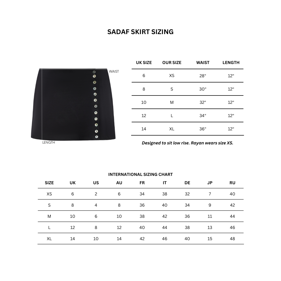 The Sadaf Mini Skirt is designed to sit low rise, if between sizes take the smaller one. Rayan wears size XS.