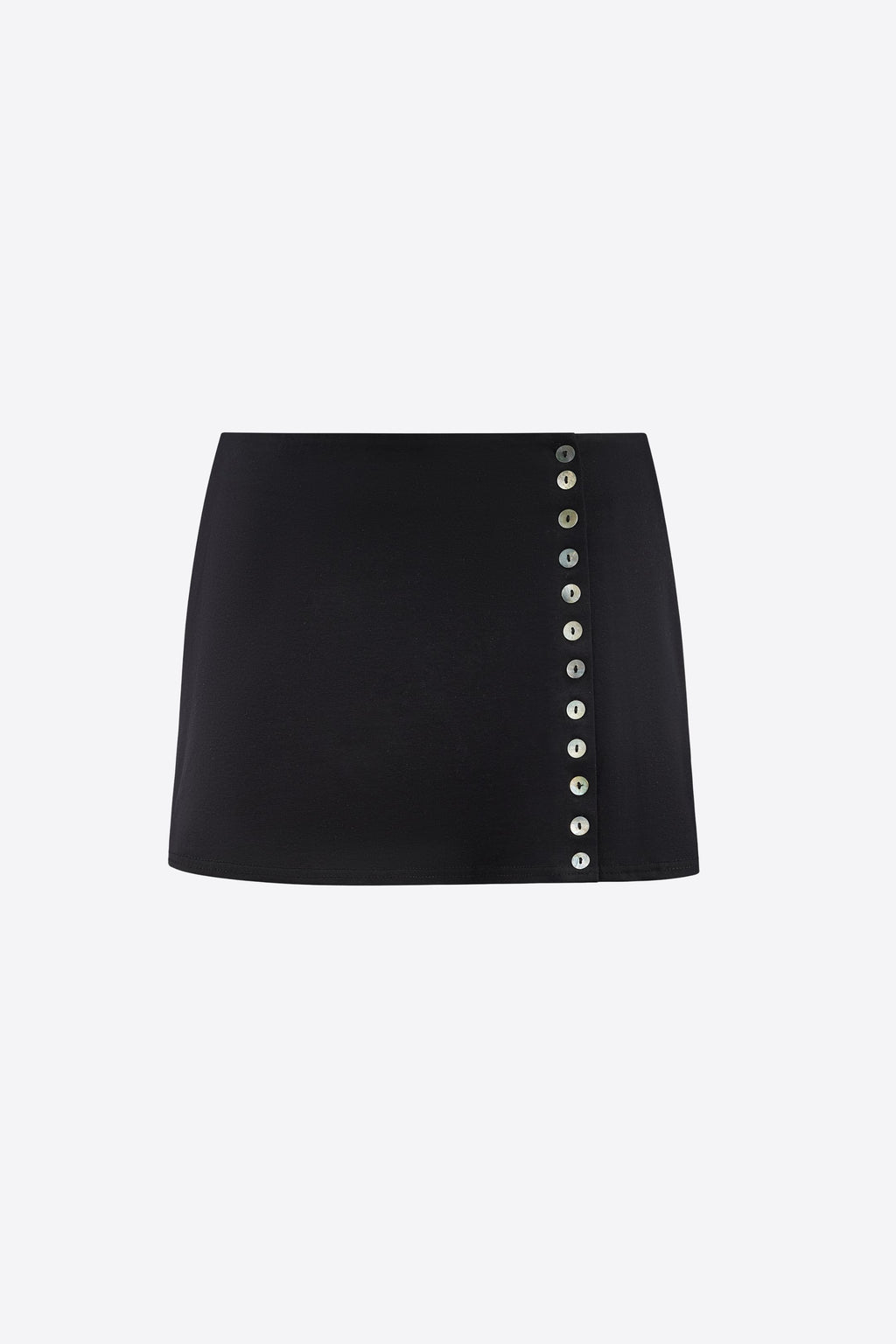The Sadaf Skirt, a mini made from cotton jersey finished with a side placement of functional Mother of Pearl buttons. Designed to be playful.