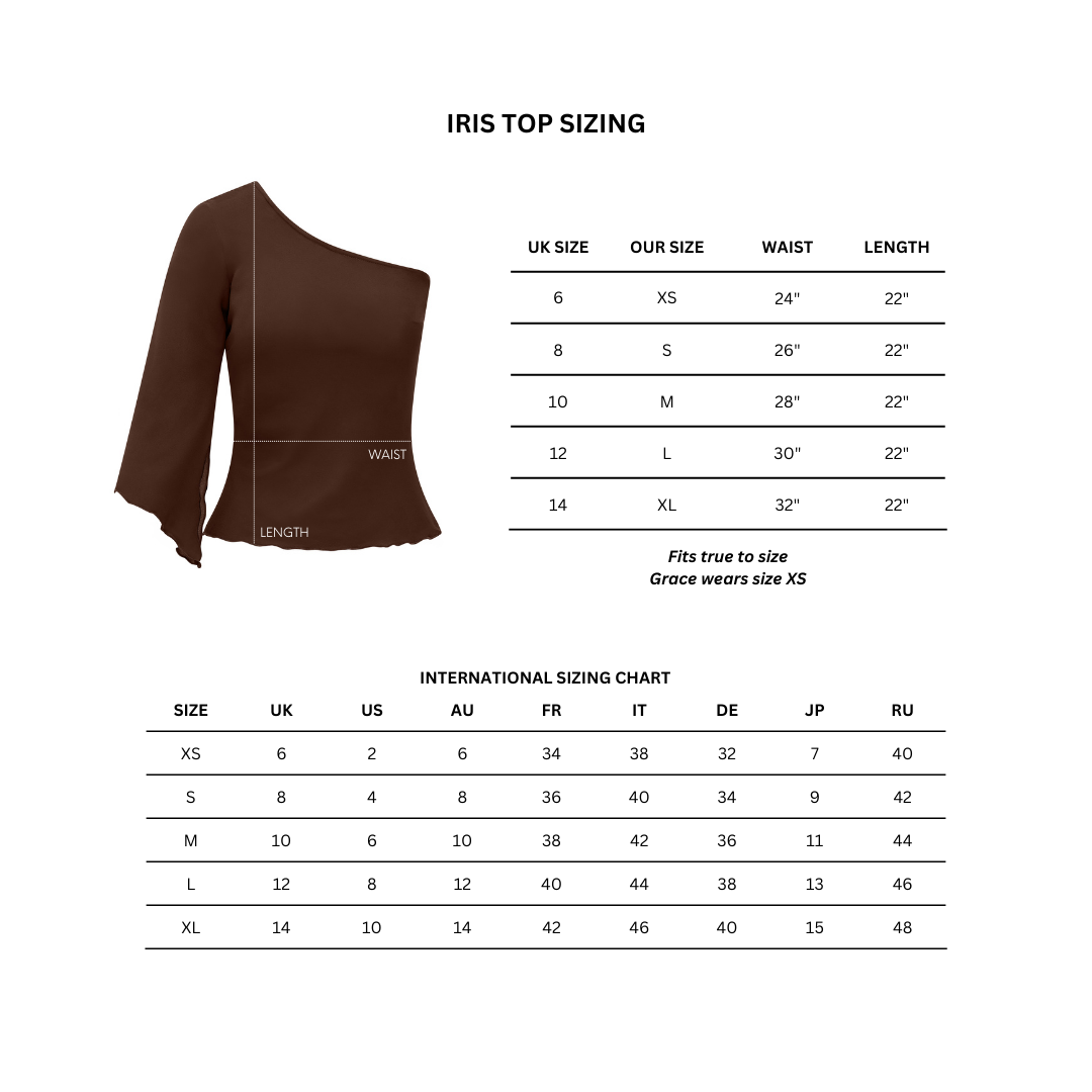 The Iris top fits true to size. If between sizes, we recommend sizing up. Grace is 5'9" and wears XS.