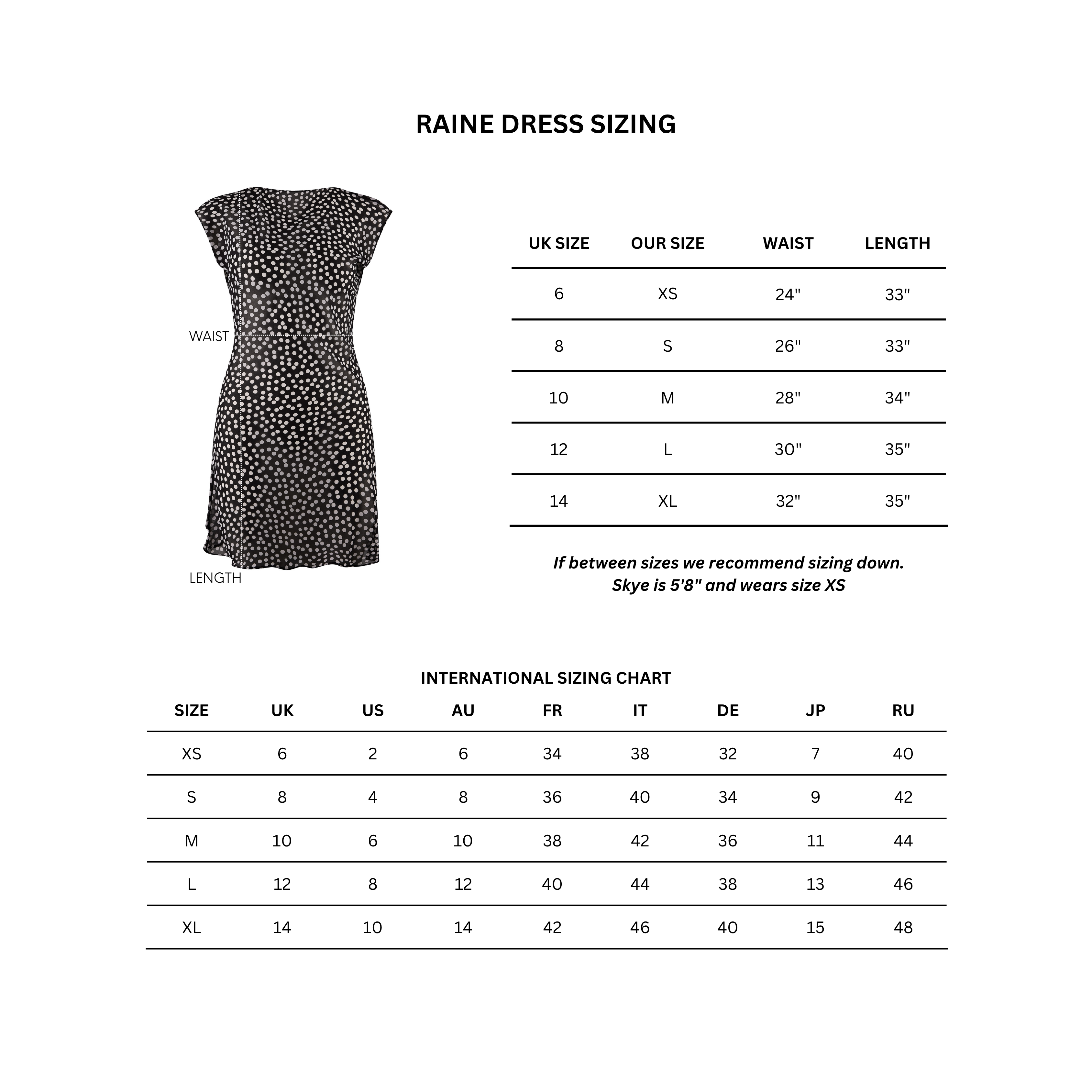 Runs slightly big, if between sizes we recommend sizing down. Skye is 5'8" and wears size XS.