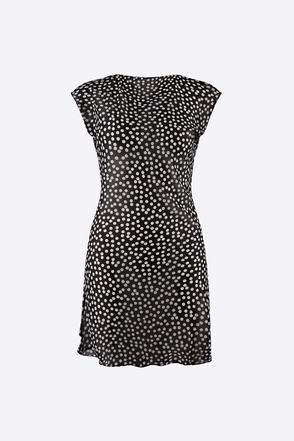 The Raine Dress, a polka dot mini dress cut on the bias, featuring a straight neckline and cap sleeves. Be spotted in Susa.