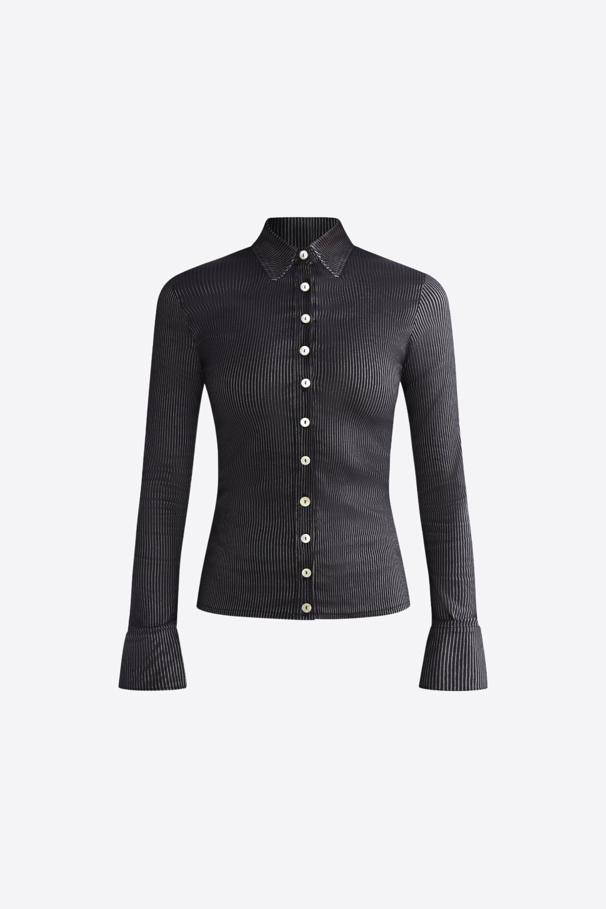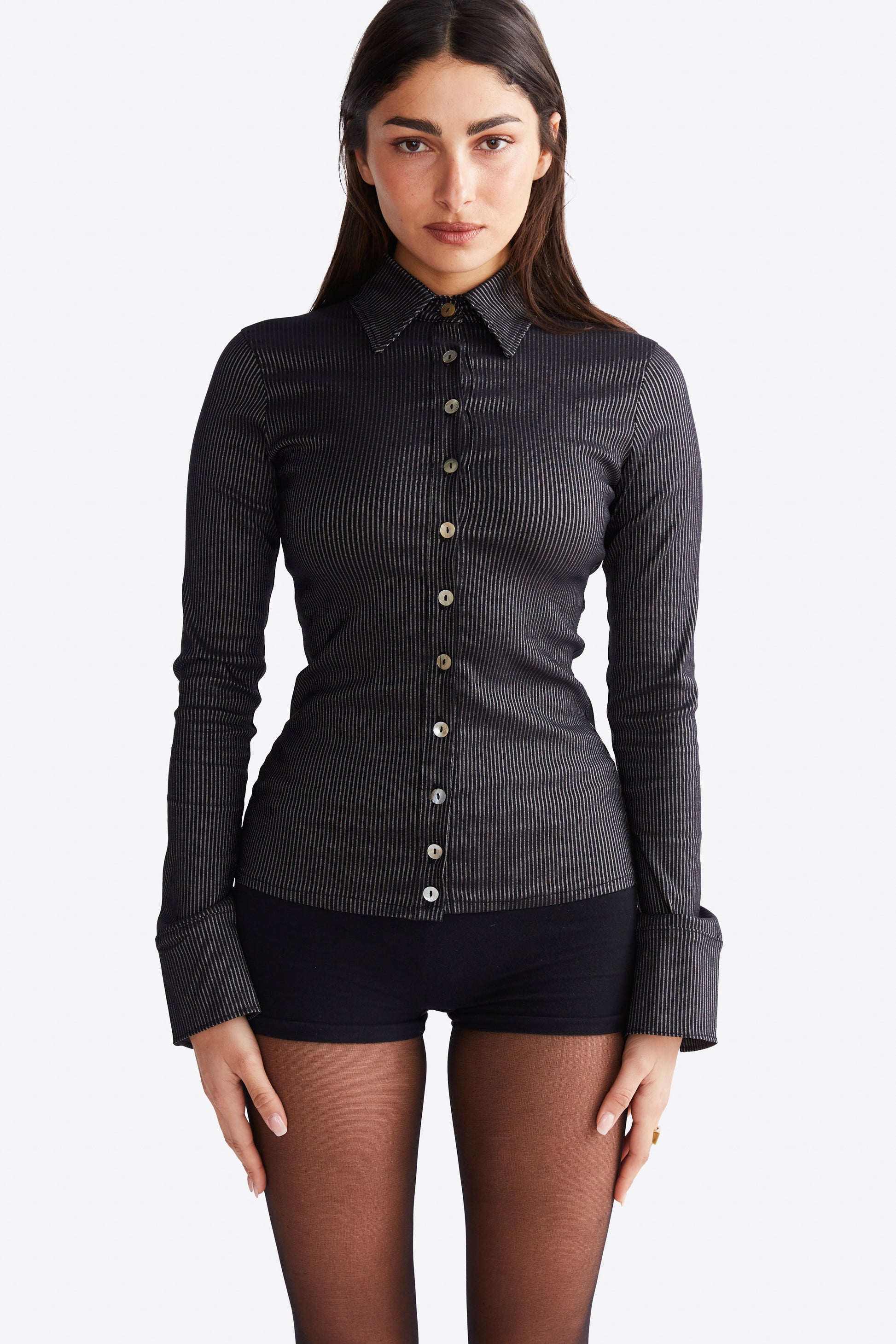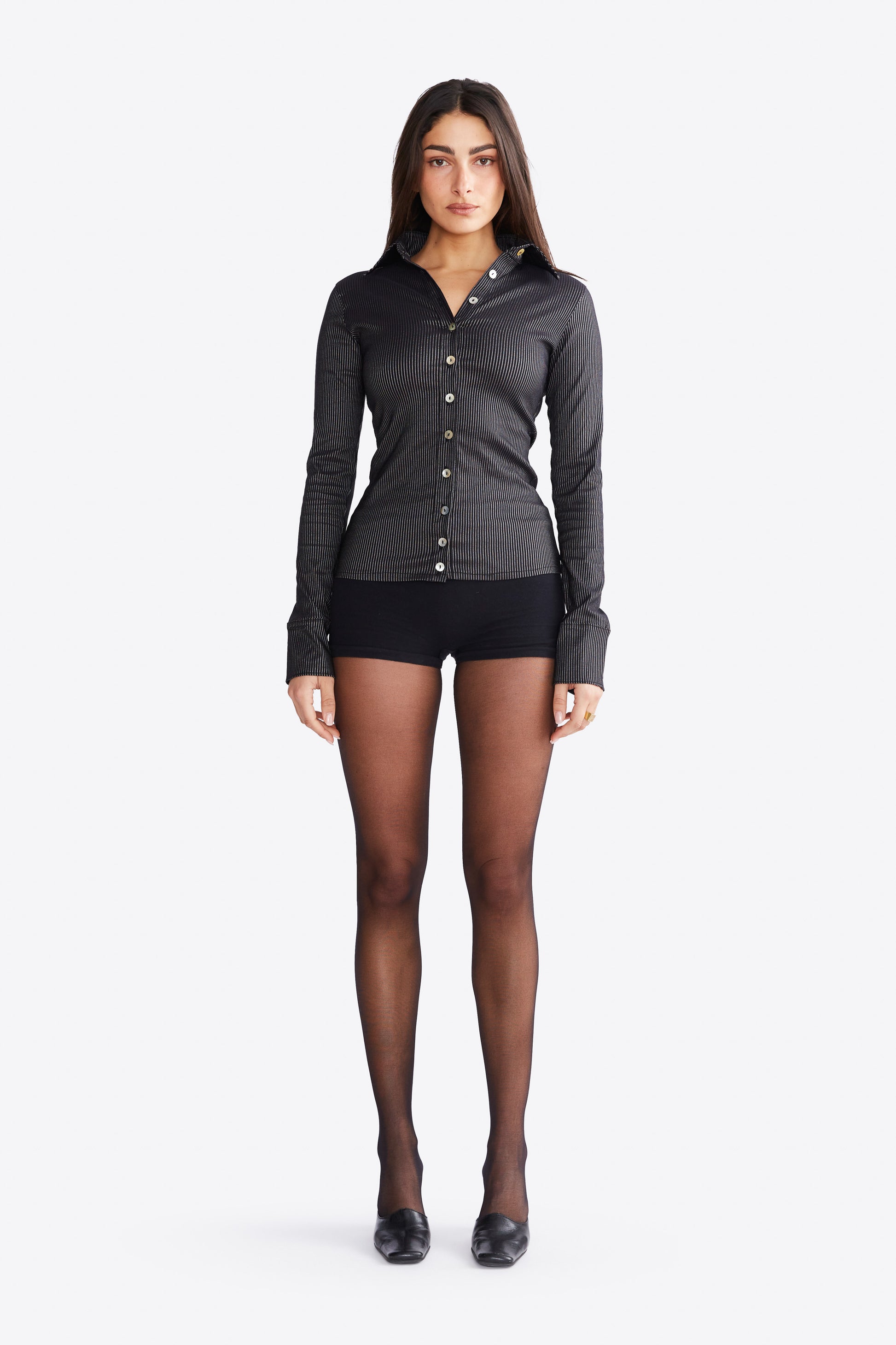 The Sienna Shirt, a pinstripe button-down shirt with French cuffs and collar, finished with Mother of Pearl buttons. The Sienna is tailored for the perfect fit.